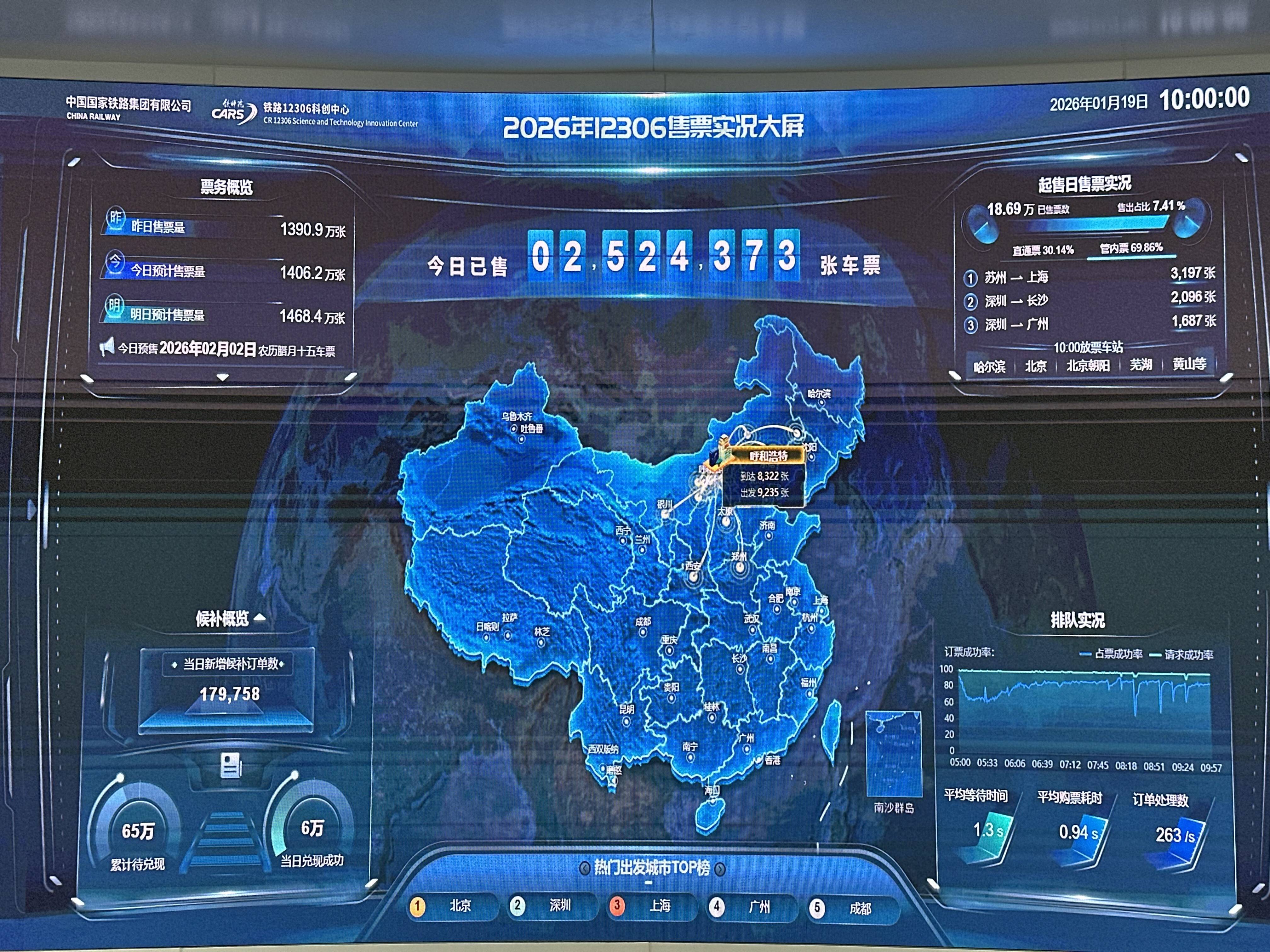 铁路12306监控中心售票实况大屏上,售票数据、候补数据等不断更新。“截至10时整,12306平台共售出252.4万张车票。热门出发城市前五名为北京、深圳、上海、广州、成都。”中国铁道科学研究院集团有限公司客运数智研究室副研究员易超说。