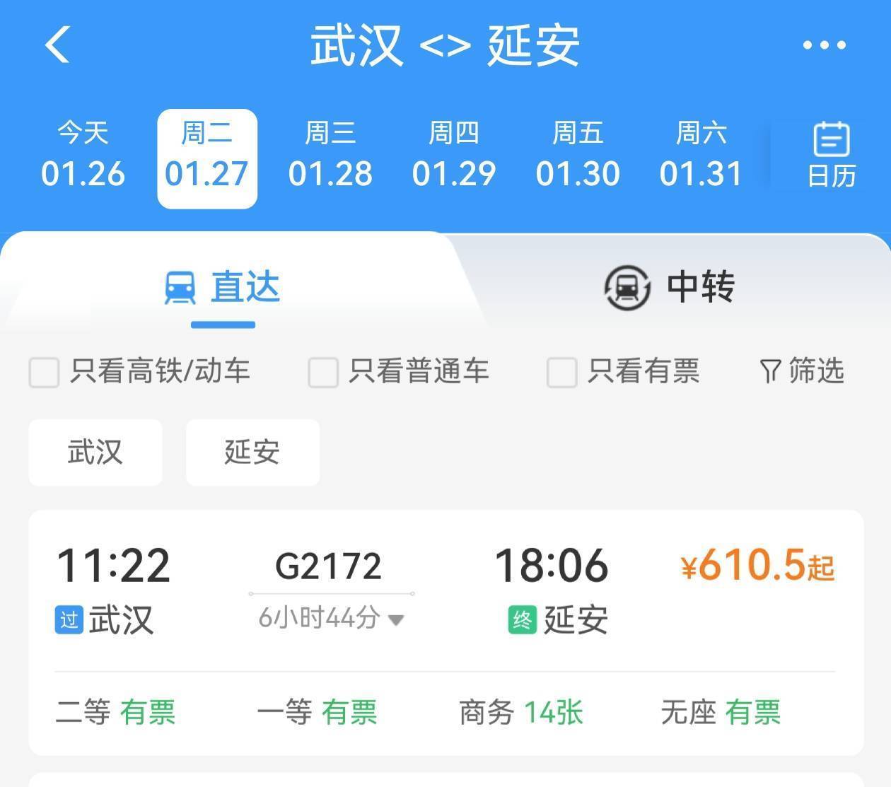 湖北日报讯(记者胡祎)12306APP显示,1月27日起,G2172次列车将正式开行。该列车由中国铁路西安局集团有限公司西安客运段担当乘务,从广州始发,终到延安。
