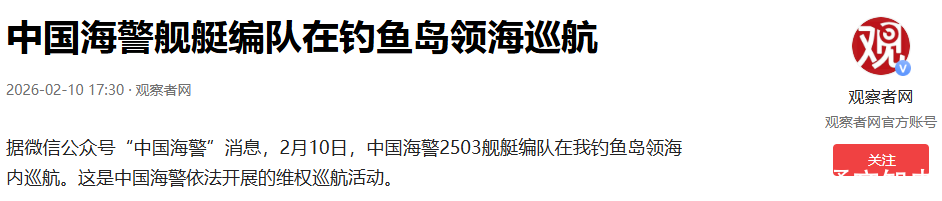 2026-02-10 17:30·观察者网 中国海警舰艇编队在钓鱼岛领海巡航