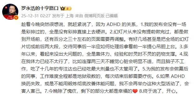 3月4日,罗永浩分享了自己确诊ADHD的经过。他说自己44岁在儿科确诊ADHD,害怕尴尬就坐在孩子旁边,让别人误以为自己是就诊孩子的爸爸,到自己就诊时一个箭步窜到诊室。此前,罗永浩在2025年12月30日的科技创新分享大会上迟到40多分钟,次日凌晨通过自曝长期受ADHD(注意缺陷多动障碍)困扰,引发公众关注。