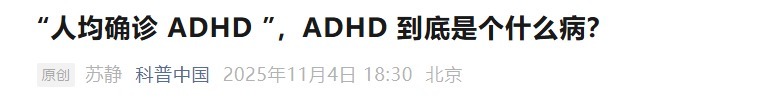 据科普中国,ADHD,全称“注意缺陷-多动障碍”(Attention Deficit Hyperactivity Disorder),是一种神经发育障碍,也就是我们常说的“多动症”。顾名思义,ADHD既可能表现为“注意力缺陷”,也可能表现为“多动”和“冲动”。不过,需要澄清的是,ADHD的核心问题并不在于“注意力不足”,而在于“注意力调节失灵”。也就是说,有ADHD的,并非完全无法专注,而是像一台老旧的收音机,信号忽强忽弱,因此会表现为一会儿过度专注,一会儿分心到天边,完全无法掌控注意力的“频道切换”。