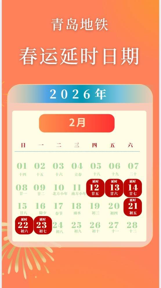 r为全力保障您的春运旅途便捷顺畅,2月12日—14日(腊月二十五至二十七,共3天)、2月21—23日(正月初五至初七,共3天),青岛地铁1、3号线首车时间提前、末车时间延后,同时8号线将在早间05:20及夜间23:00各增开直达列车1列。