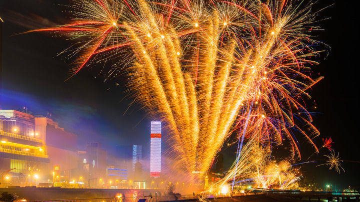 除夕夜,“定海神针”观光塔与滨江烟花秀交相辉映。(受访者供图)