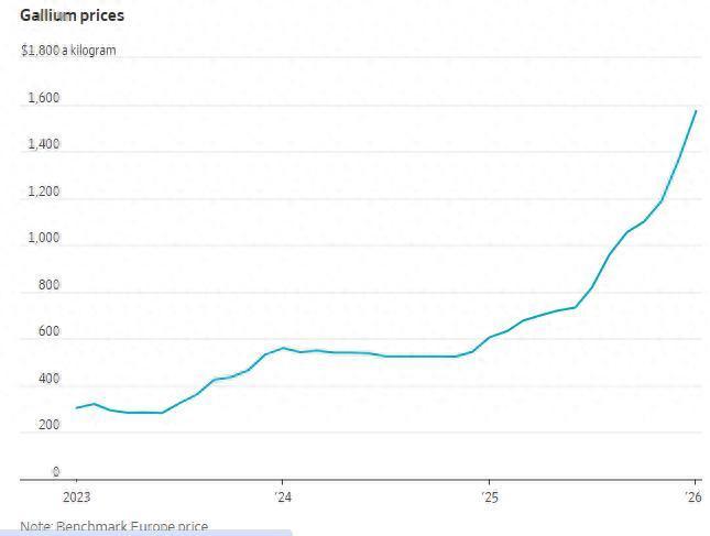 行情数据显示,过去两年间,国际基准的鹿特丹低纯度镓价已上涨了近三倍。根据Argus Media的数据,今年1月平均价格创下每公斤约1572美元的历史新高。